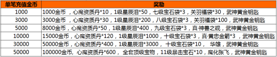 活动内容:活动期间,游戏内开启单笔充值活动,玩家每单笔充值一定金额,即可获得相应的充值奖励。