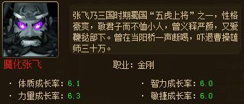 2、魔化张飞,全属性6.0以上成长,全体攻击技能,有几率造成眩晕。升级专属武器有几率将受到的物理伤害变为1。