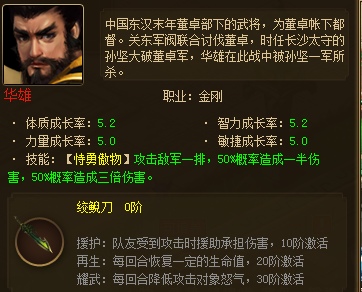 武将:华雄(刚毅的外表,证明他是一个真男人,拥有援护的专属技能,更是可以保护队友免遭貂蝉等普通攻击减怒气的荼毒,我挡,我挡,我再挡!专属技能耀武:从第二回合开始,每回合减少攻击对象50点怒气更是敌人噩梦般的存在!不要以为我只是个肉,三倍技能伤害会让你哭!!)