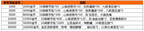 活动内容:活动期间,游戏内开启单笔充值活动,玩家每单笔充值一定金额,即可获得相应的充值奖励。