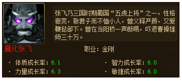 1、魔化张飞,全属性6.0以上成长,全体攻击技能,有几率造成眩晕。升级专属武器有几率将受到的物理伤害变为1。