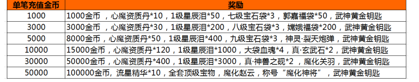 活动内容:活动期间,游戏内开启单笔充值活动,玩家每单笔充值一定金额,即可获得相应的充值奖励。