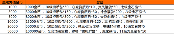活动内容:活动期间,游戏内开启单笔充值活动,玩家每单笔充值一定金额,即可获得相应的充值奖励。