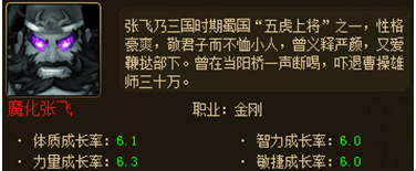 1、魔化张飞,全属性6.0以上成长,全体攻击技能,有几率造成眩晕。升级专属武器有几率将受到的物理伤害变为1。