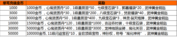活动内容:活动期间,游戏内开启单笔充值活动,玩家每单笔充值一定金额,即可获得相应的充值奖励。