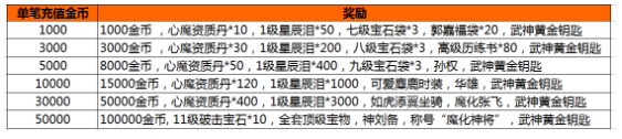 活动内容:活动期间,游戏内开启单笔充值活动,玩家每单笔充值一定金额,即可获得相应的充值奖励。
