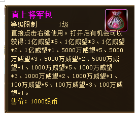 活动奖励:直上将军包,大量银币,聚魂幡,铸魂石,超级历练书,天命宝盒,出师令!