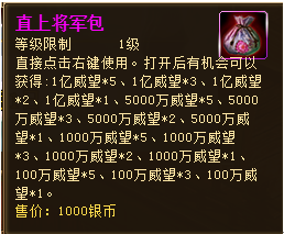 活动奖励:直上将军包,大量银币,聚魂幡,铸魂石,超级历练书,天命宝盒,出师令!