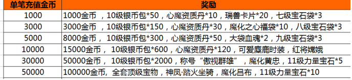 活动内容:活动期间,游戏内开启单笔充值活动,玩家每单笔充值一定金额,即可获得相应的充值奖励。