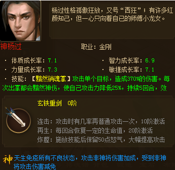 本周带来的是金庸笔下绝世高手-“杨过”,赋予神将属性,免疫所有不良状态,除了本身超强属性之外,最强之处在于技能“黯然销魂掌”,单体造成370%的伤害,可谓是不出手则已,一出手必重伤。