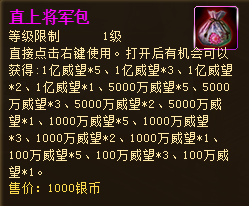 活动内容:活动期间,通过活动首次充值获得的魔法钥匙可以在活动使者处开启隐藏了多年的秘密,只需拥有该魔法钥匙,即可以30金币/个的价格购买“直上将军包”,最高军衔,触手可及!!