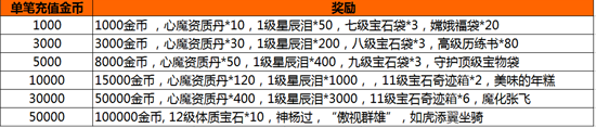 活动内容:活动期间,游戏内开启单笔充值活动,玩家每单笔充值一定金额,即可获得相应的充值奖励。