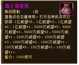 活动奖励:直上将军包,大量银币,聚魂幡,铸魂石,超级历练书,天命宝盒,出师令!