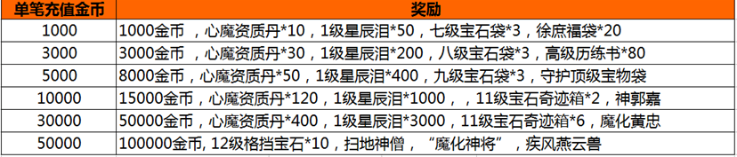 活动内容:活动期间,游戏内开启单笔充值活动,玩家每单笔充值一定金额,即可获得相应的充值奖励。