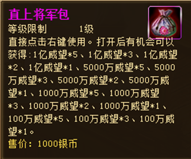 活动奖励:直上将军包,大量银币,聚魂幡,铸魂石,超级历练书,天命宝盒,出师令!