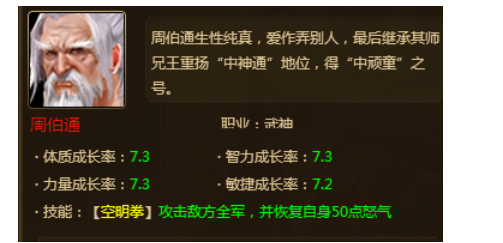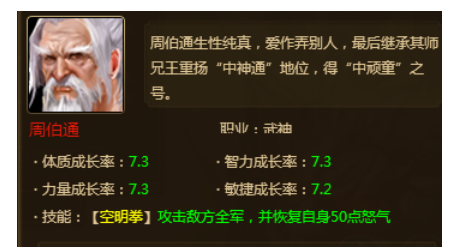 本周武将新增老顽童——周伯通,技能“空明拳”,全体攻击敌方,造成大量伤害,并恢复自身50点怒气。
