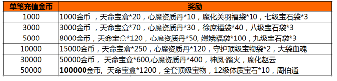 活动内容:活动期间,游戏内开启单笔充值活动,玩家每单笔充值一定金额,即可获得相应的充值奖励。