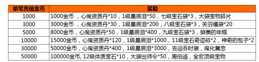 活动内容:活动期间,游戏内开启单笔充值活动,玩家每单笔充值一定金额,即可获得相应的充值奖励。