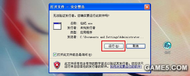 ④双击“仙纪”图标,并点击弹框的“运行”选项。稍等片刻,即可进入微端界面。