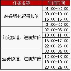 【活动内容】在活动期间每日特定时间区间升级装备、仙宠修道进阶、坐骑修道进阶。容易触发双倍祝福。即升级装备平时+1,活动区间有几率出现双倍+1 +1。不容错过哦!