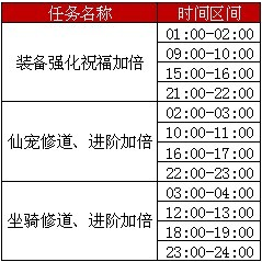 【活动内容】在活动期间每日特定时间区间升级装备、仙宠修道进阶、坐骑修道进阶。容易触发双倍祝福。即升级装备平时+1,活动区间有几率出现双倍+1 +1。不容错过哦!