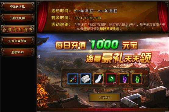 为答谢广大玩家的厚爱,玩家在合服后五天内,每天单笔充值大于1000元宝都可以领取每日首充大礼。奖励丰厚!