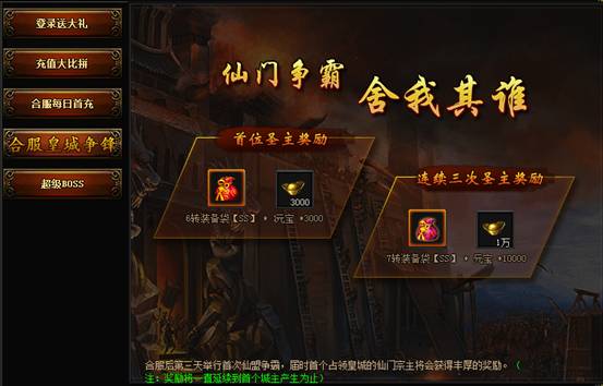 在合服后,仙门争霸活动首次占领皇城的圣主,以及连续三次占领的圣主将会得到额外的元宝奖励。首次奖励3000元宝、6转SS装备。连续三次占领的圣主奖励10000元宝、7转SS装备。