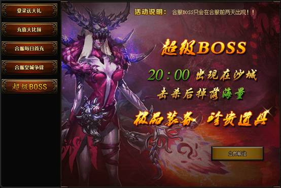 合服BOSS智慧在合服前两天出现,每晚20:00出现在沙城。击杀后掉落海量极品装备、珍贵道具!