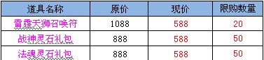 「战神灵石礼包」:打开可获得绑定六级力量石*1、六级体质石*1、六级敏捷石*1