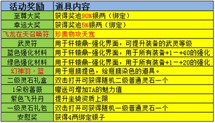 【活动奖励】:武灵符、蓝色强化材料、幻神羽•蓝、二级灵石礼盒、紫色飞升丹、飞龙在天召唤符等。。。