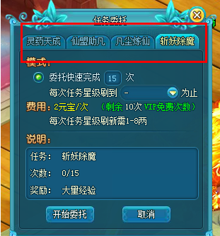 为了让玩家更轻松、更便捷地完成委托任务,任务委托功能界面集合了凡尘炼仙、仙盟助凡、斩妖除魔、灵药天成四大循环任务,让玩家能在一个界面就能完成所有委托操作。