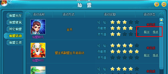 仙盟活动界面添加了“前往”及“传送”链接,玩家可以通过仙盟活动界面直接定位参与活动。