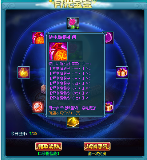 3、 月光宝盒可开出小霸王龙召唤符、紫电魔狼坐骑、凝金砂、神翼之魂等珍贵道具。