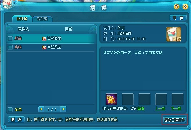 注意,为了不让玩家稀里糊涂获得道具,只有已读的邮件可将附件统一提取,未读邮件中的附件则仍然需要阅读后才能应用此功能。