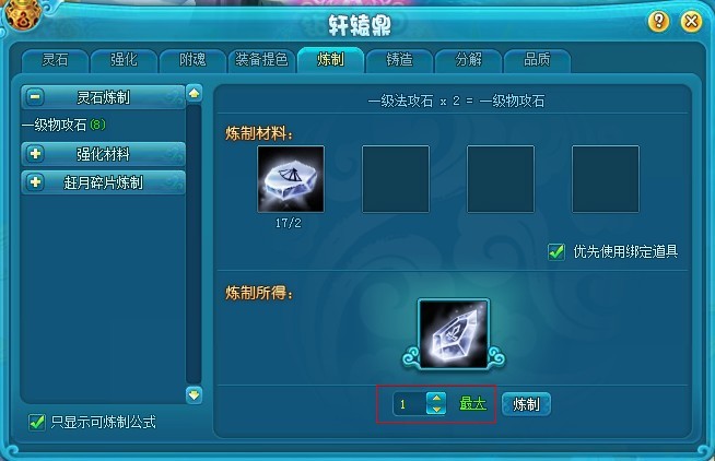 为了方便玩家同时炼制多个物品,炼制界面增加“一键最大化”数量按钮,点击后炼制数量将自动变为最大值。