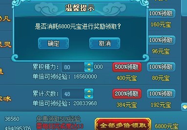 “乾坤仙脉”功能中,玩家点击“全部多倍领取”按钮,新增二次提示确认,减少玩家误操作的机会。