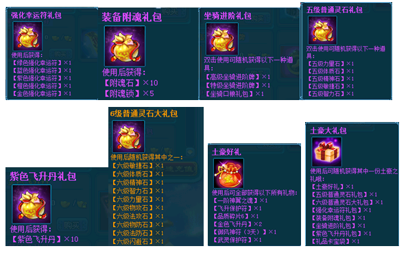 【土豪大礼包】:使用后可随机获得以下一件道具:强化幸运符礼包×1、装备附魂礼包×1、坐骑进阶礼包×1、五级普通灵石礼包×1、紫色飞升丹礼包、礼品卡礼包×1、6级普通灵石大礼包×1、土豪好礼×1
