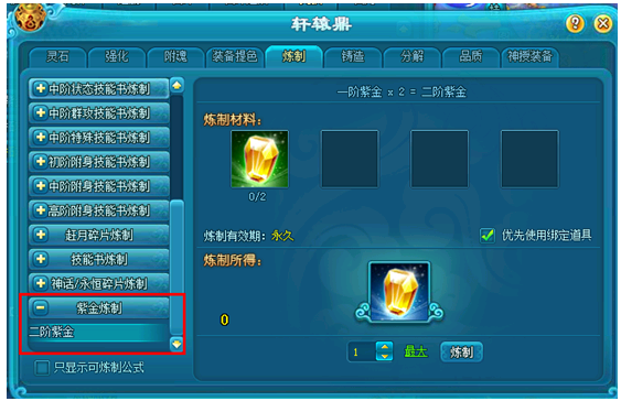 注:为方便已经把【兑换令】兑换为一阶紫金的玩家获得二阶材料,游戏同时开放二阶紫金的炼制公式: