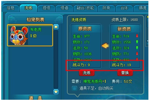 为了方便玩家了解洗练所得的资质对宠物战斗力的影响,游戏优化了宠物洗练界面,在“原资质”和“新资质”位置增加资质战斗力的显示,为玩家提供参考。