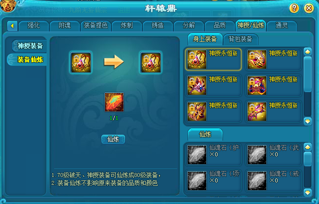 70级完美破天装备(包括神授装备)可在『轩辕鼎』-『神授/仙炼』界面,仙炼成80级装备。