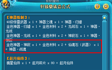 铸造公式:70级神器x1+【仙魂石】x5+【金色材料】x2=80级神器