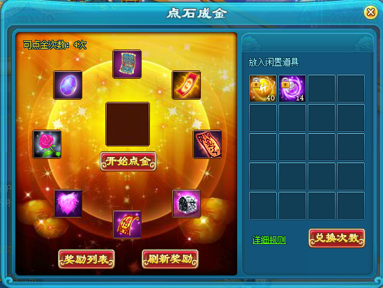 点金次数由道具兑换获得,玩家可以将闲置道具放入点金界面右侧,根据道具的颜色和数量来获得相应次数。