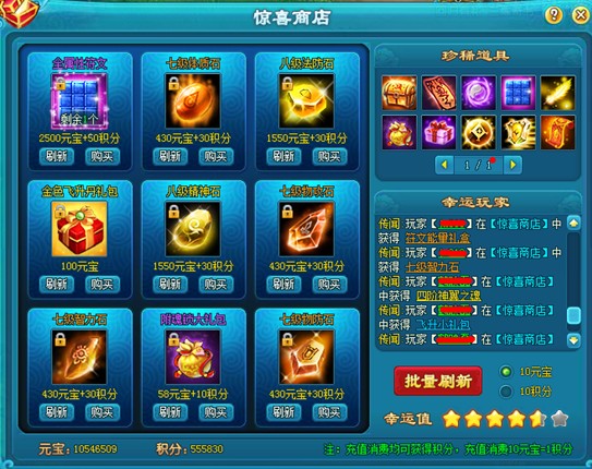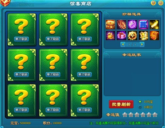 单次刷新:用完免费次数还不过瘾?单次刷新消耗2元宝就可以让惊喜继续啦。