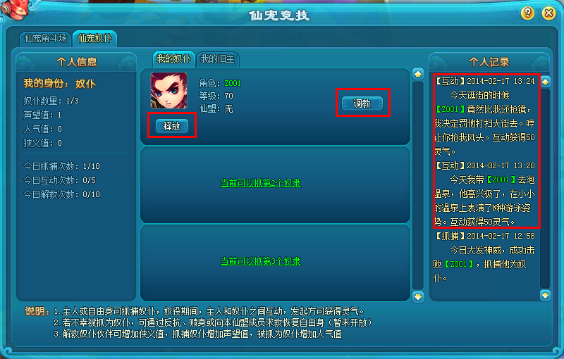 有了奴仆后,你要怎么对TA?在“仙宠奴仆”分页,做出你的选择吧,释放为自由身或是调教,都看主人你的心情啦!