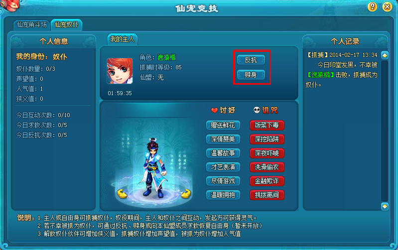 互动:就算反抗和赎身都没成功,咱还可以讨好或诅咒,发起者有灵气奖励的哦!
