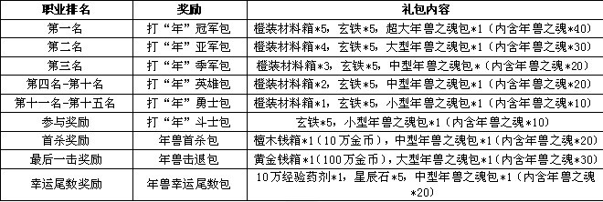 【规则】活动期间对年兽造成伤害即可获得丰厚奖励,另有职业排名奖励,首杀奖励,最后一击奖励,幸运尾数奖励等多重大礼等着你!