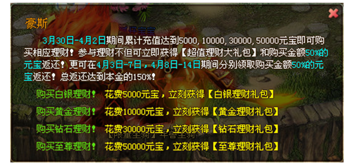 【内容】活动期间累计充值达到5000,10000,30000,50000元宝的玩家可购买四种相应的理财,机会难得,千万不要错过哦!更多详情请前往【豪斯】处查看!