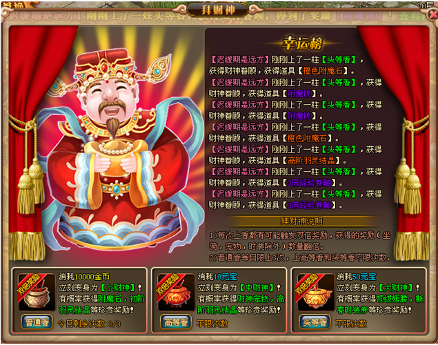 【规则】活动期间可前往天空之城NPC【财神】处进行上香获得各种丰富奖励!