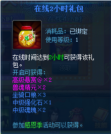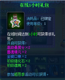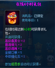 【活动内容】:1.每天在线时间累积打到1小时、2小时和4小时可获得感恩礼包