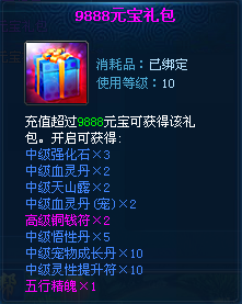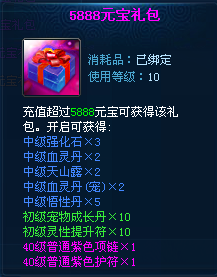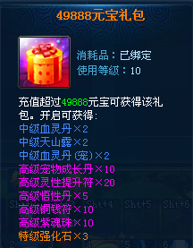 中级铜钱符×3、洗炼锁×5、紫金×1、千年神源×1、高级血灵丹×1、高级天山露×1、高级血灵丹(宠)×1 |